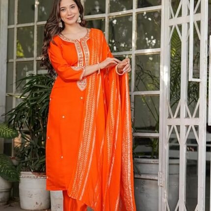 Gorgeous Orange Viscose Chanderi Kurti Suit With Sequins Work