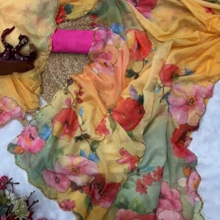 Saree Fabric :- Georgette Weightless Floral Printed Saree With Pearl Lace Border.