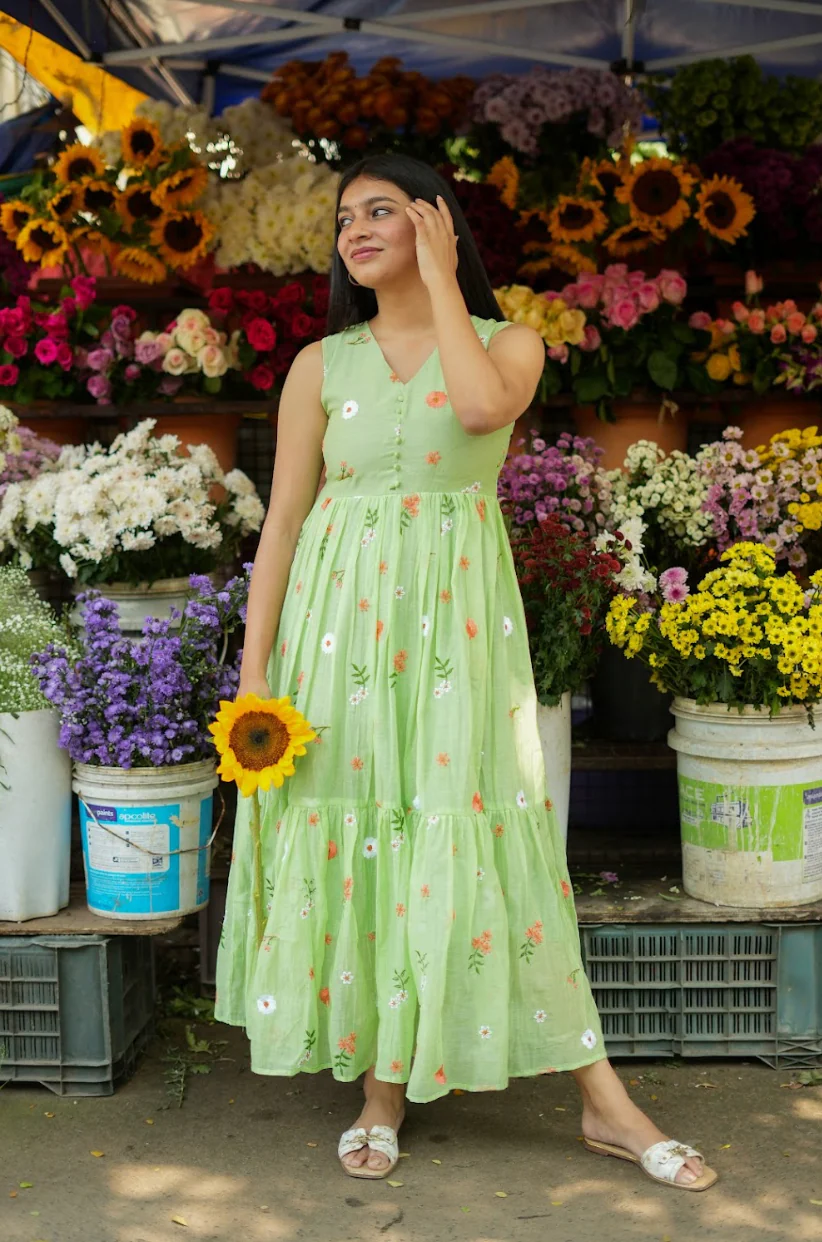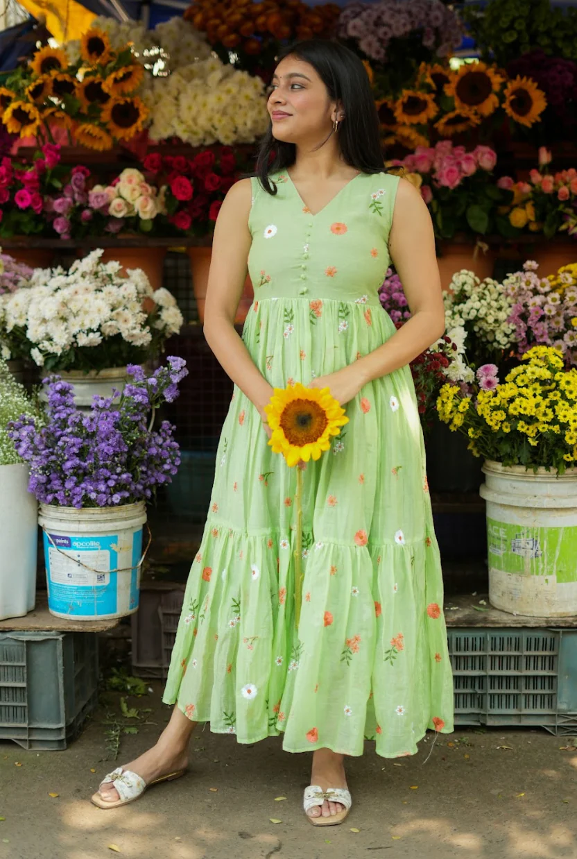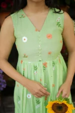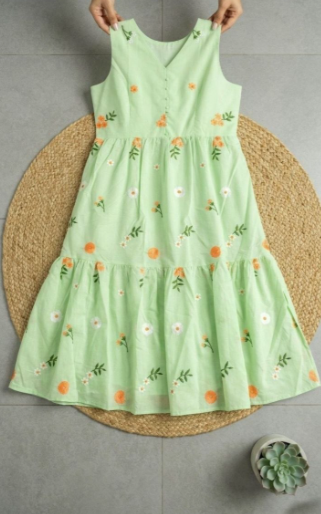 Home Hot Sale Classy Green Chanderi Cotton Dress With Floral Print