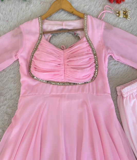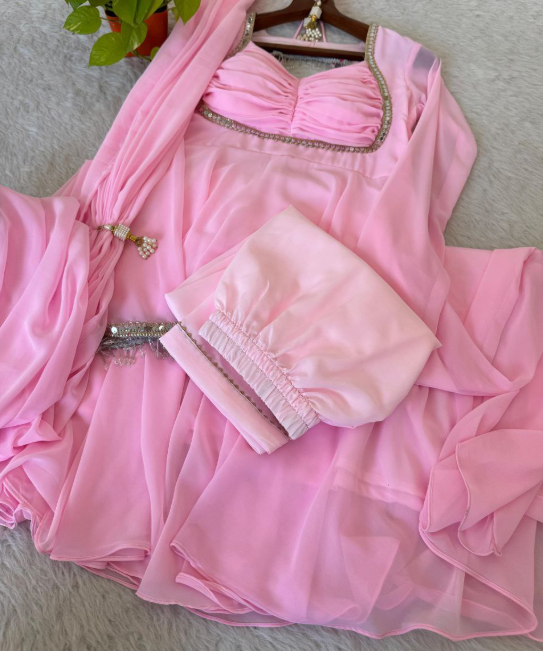 Fabrics Faux Georgette Heavy Quality Fabric With Rembo 9mm Sequins Embroidery Sleeve Moti Lace, With Crepe Pant, Dupatta For, Sequins Lace Border.