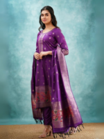A Pretty Blended Paithani Silk Salwar In A Wonderful Shade Of Purple Adorned With Pretty Buttas All Over And A Zari Paithani Border For The Perfect Neat And Classy Look. Pair This Kurti With A Purple Blended Silk Calf Length Pant And Purple Zari Dupatta To Complete The Whole Look.