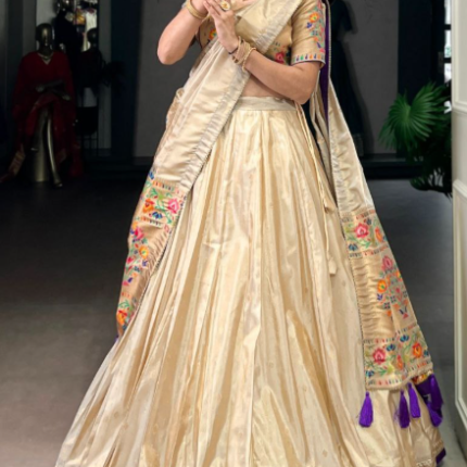 Gorgeous Beige Gold Shimmer Lehenga With Paithani Work