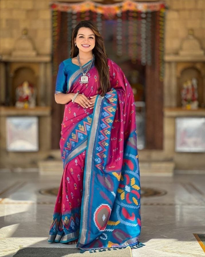 Weaving Silk Saree With Ikkat And Patola Weaving Concept In Saree, Along With Contrast Weaving Border, Contrast Rich Pallu And Contrast Blouse As Shown.
