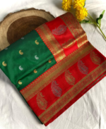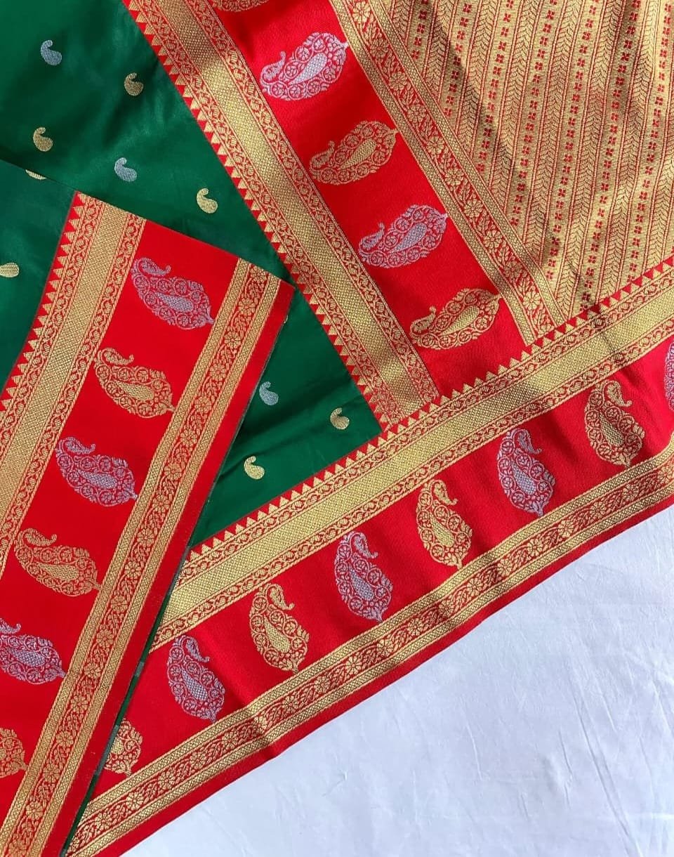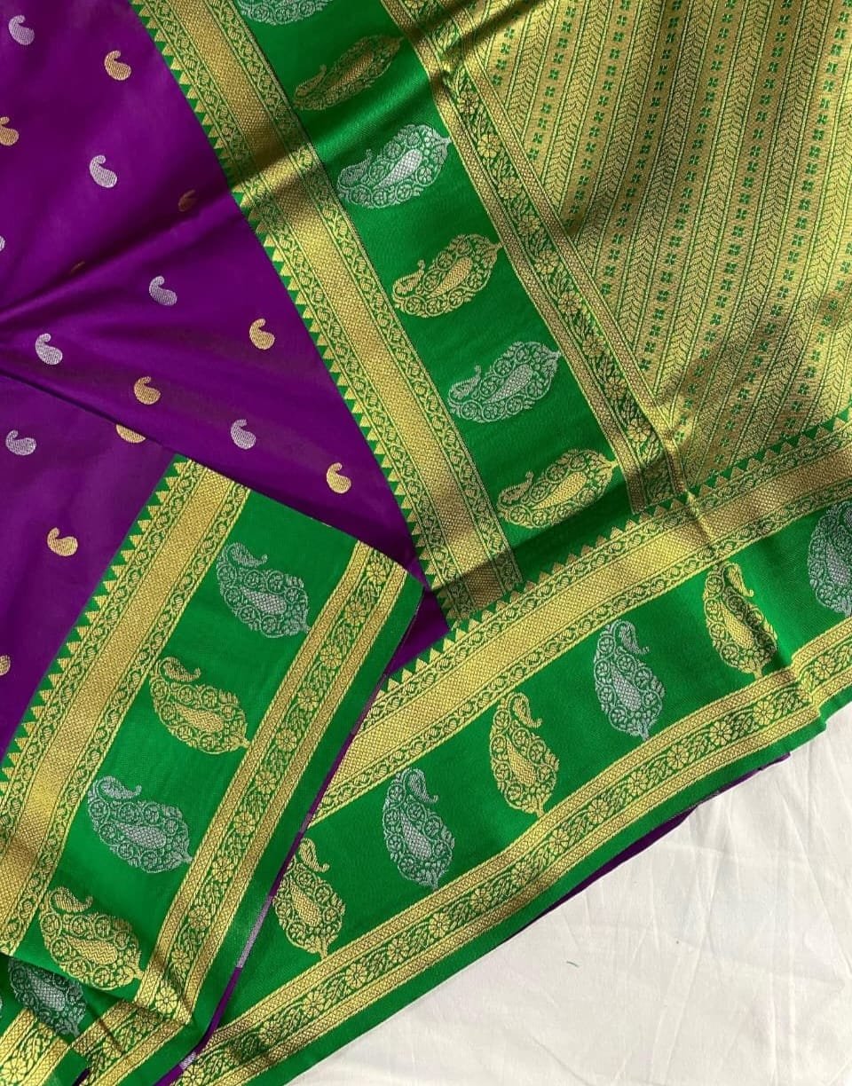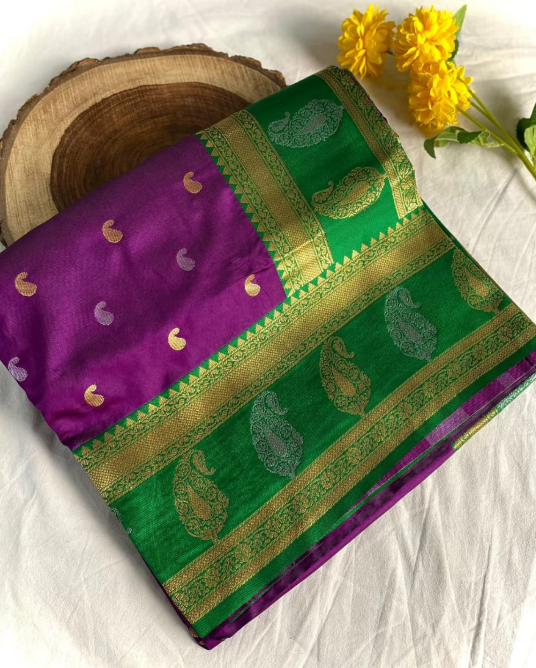 Semi Silk Saree With Golden Zari And Silver Zari Weaving Design All Over The Saree With Rich Pallu.