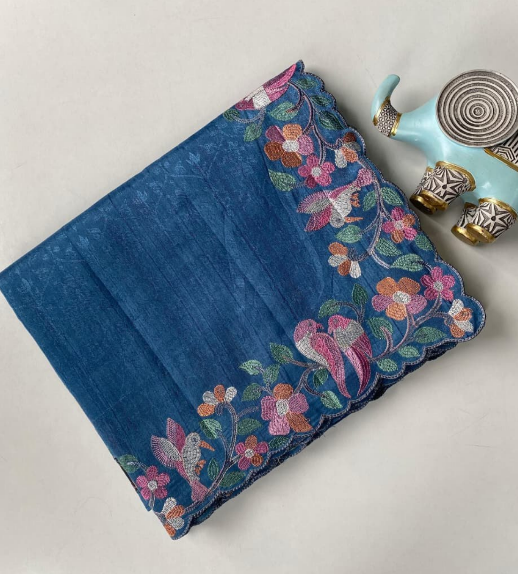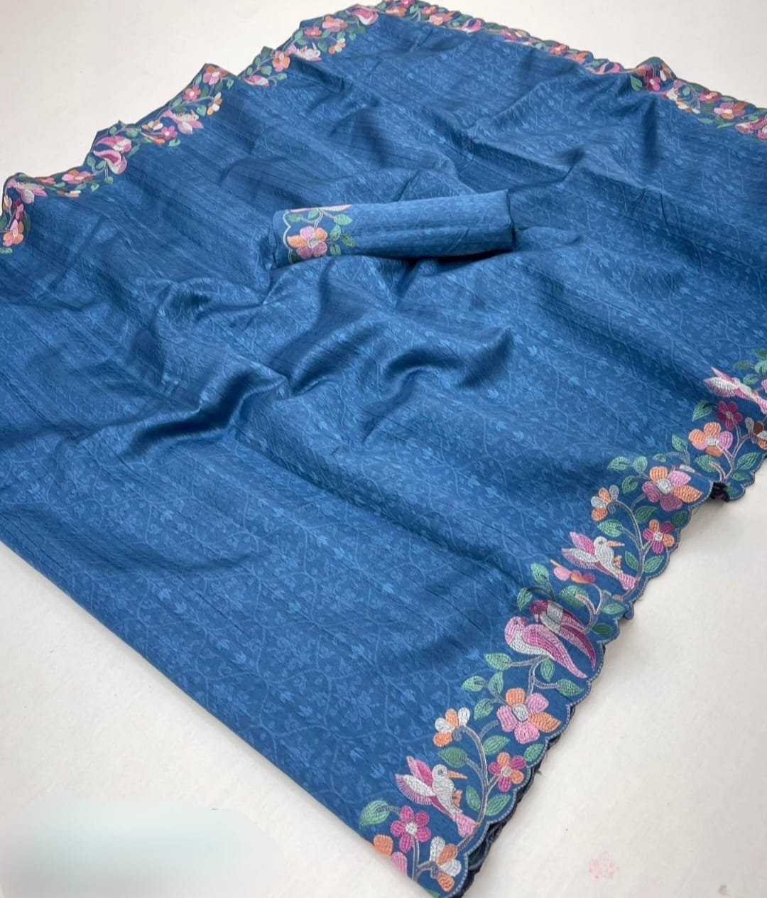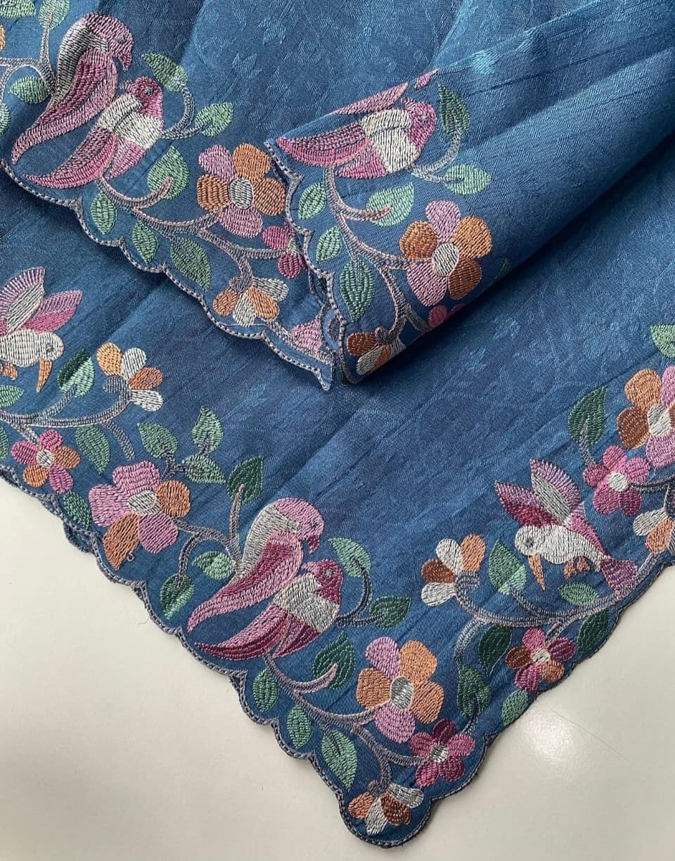 Pure Tussar Saree With Premium Contrast Embroidery All Over The Border With Floral And Bird Theme Pattern And Contrast Embroidery On The Body.