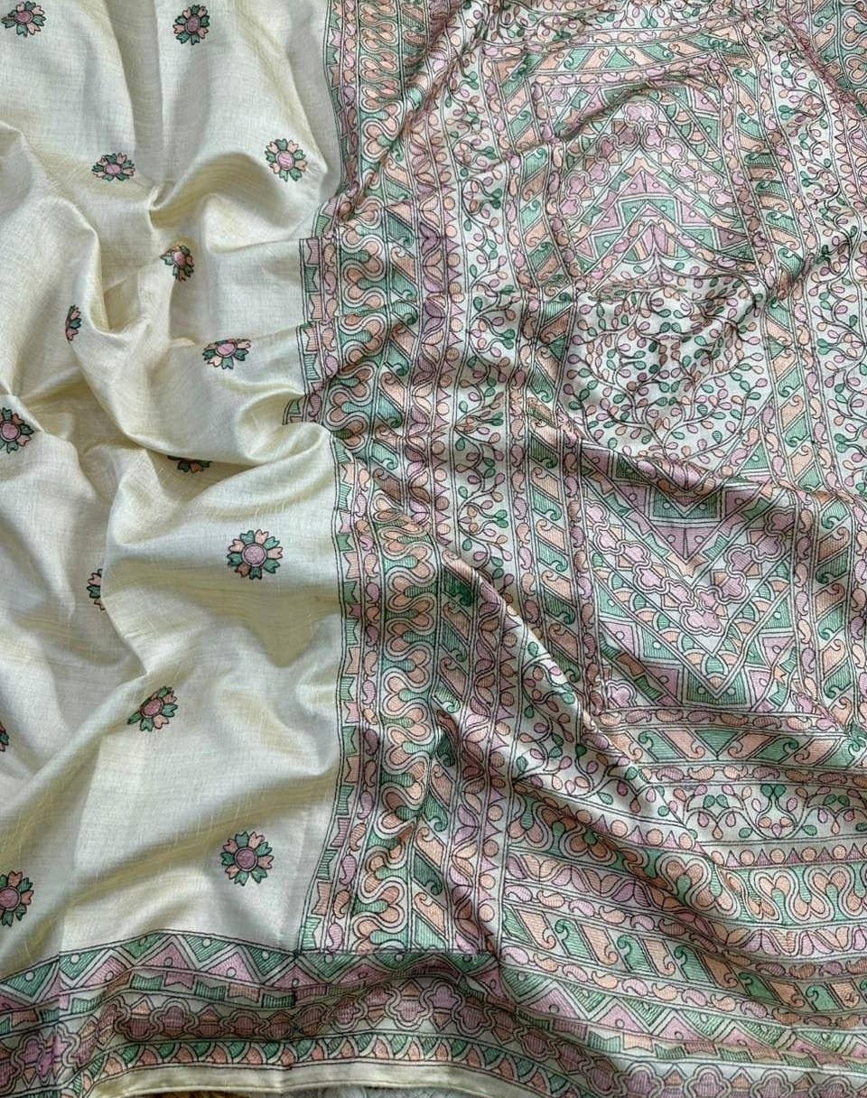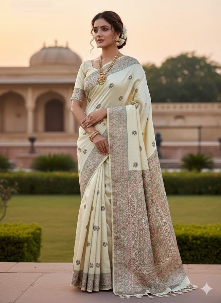 Saree : Pure Tussar Saree With All Over the Multi Thread Embroidery Work and Piping Border.