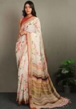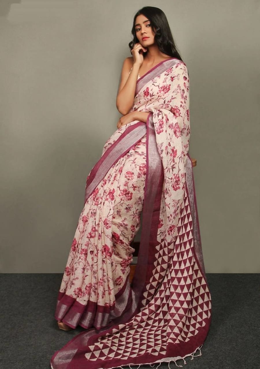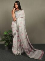 Blouse Fabric – Linen With Silver Zari Pattu With Digital Print.