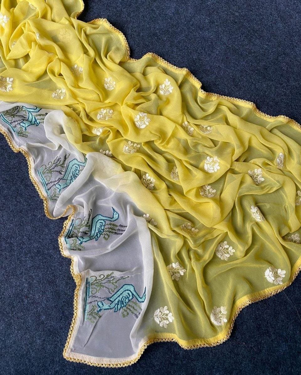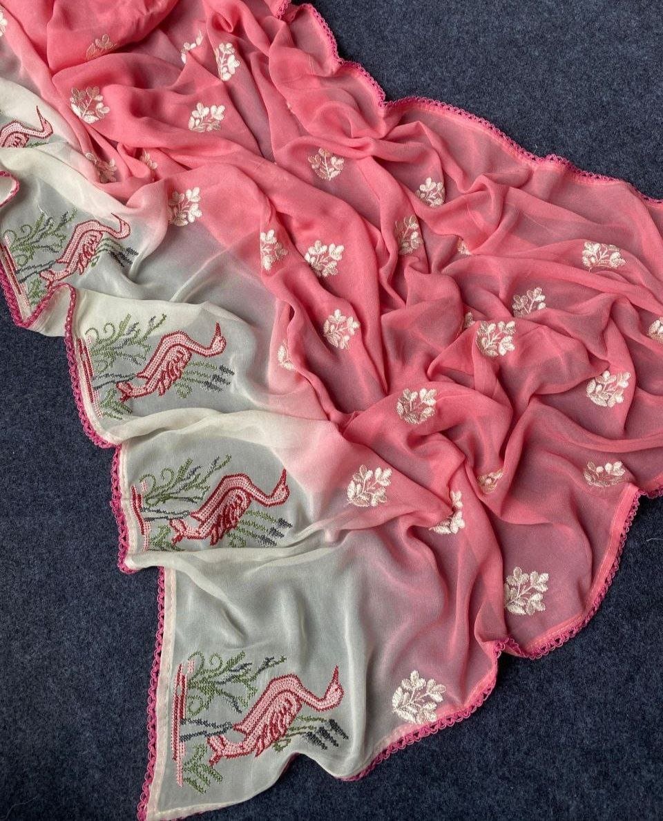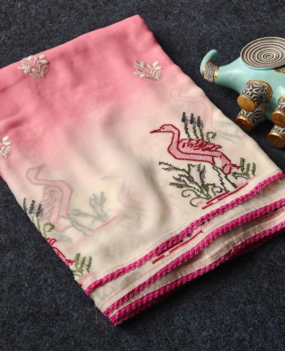 Fancy Premium Georgette Saree With Swan Embroidery Design On The Border