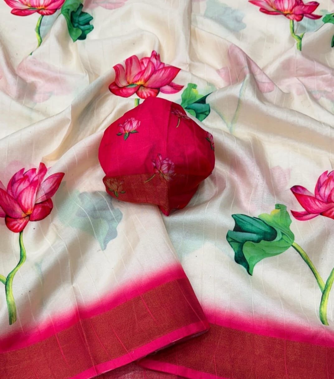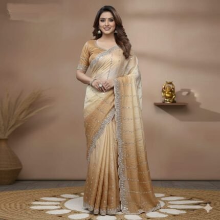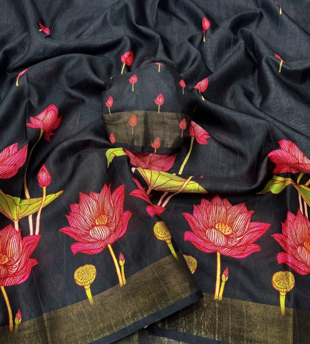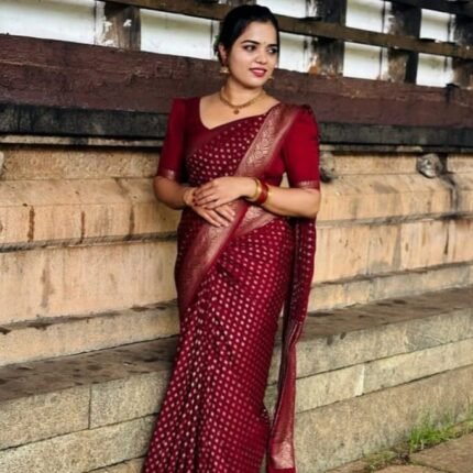 Adorned With Rich Gold Borders, the Saree Exudes Luxury and Grace. The Pallu and Blouse Complement the Full Saree, Making It a Complete Ensemble Of Opulence.