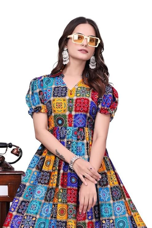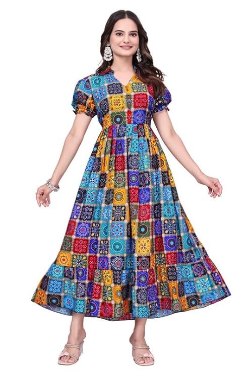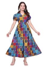 Home Hot Sale Fancy Rayon Long Gown With Puffy Sleeves & Printed Work