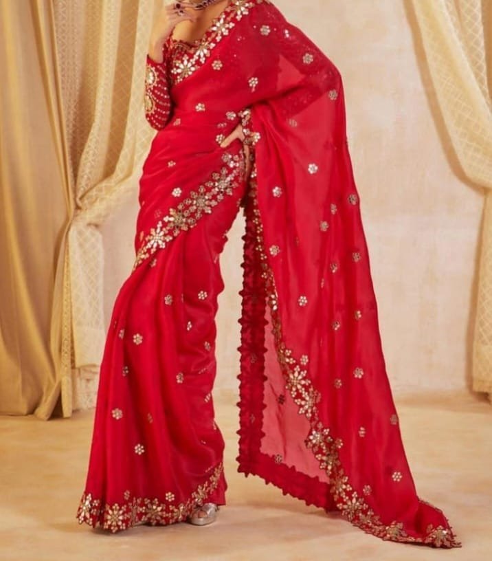 Original Mirror Work Done In Lace Border,Blouse & Sleeves