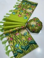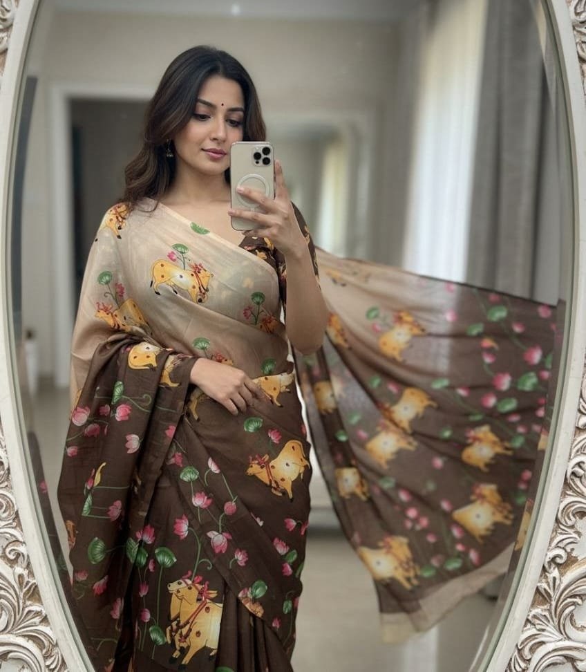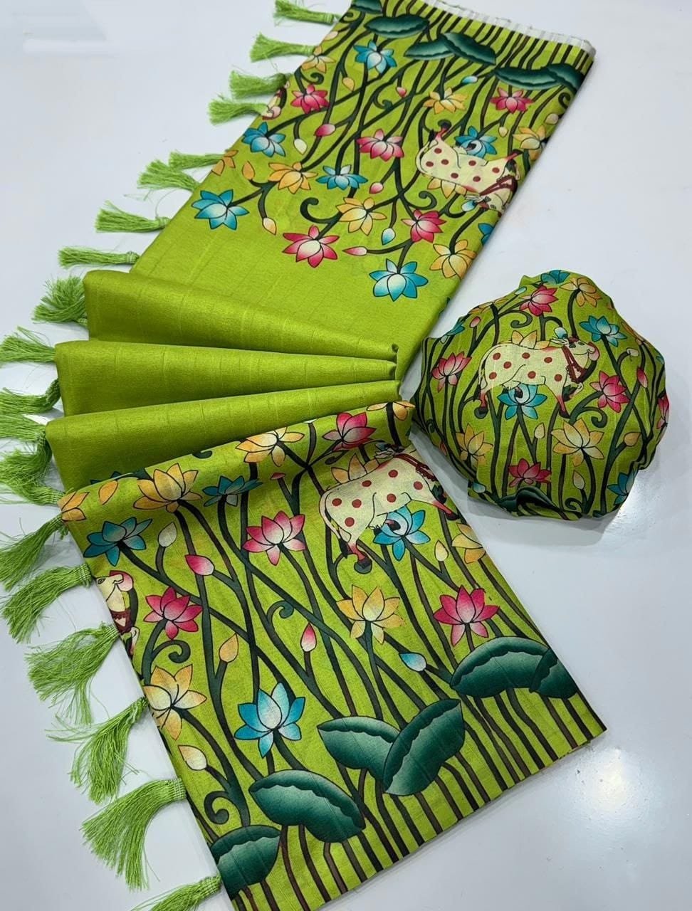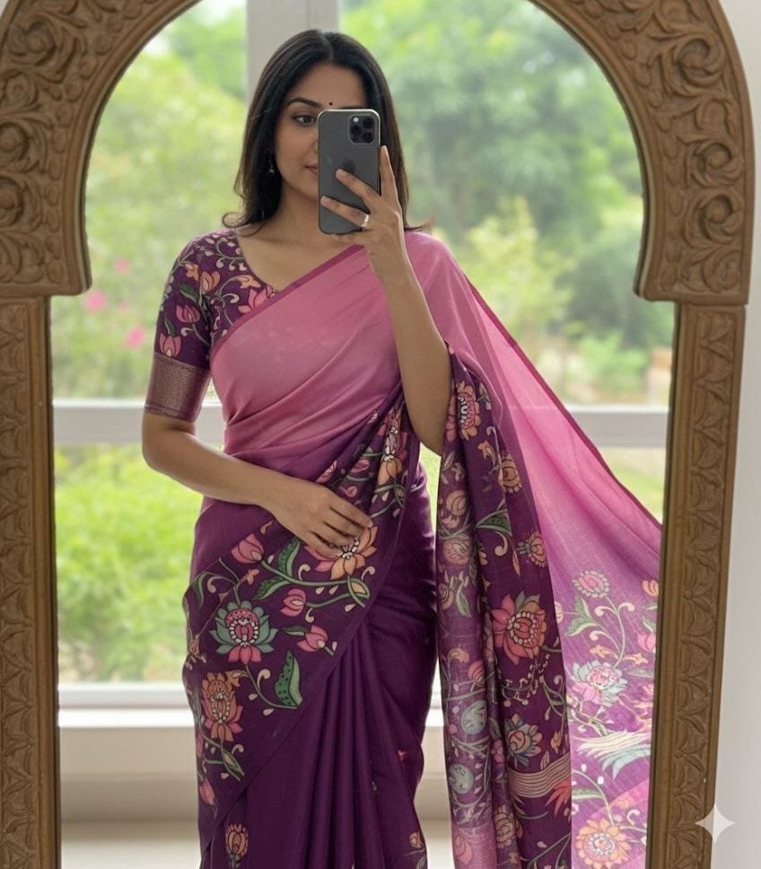 Fabric – Handloom Tussar Silk Kalamkari Digital Print Comes With Tussle on Pallu.
