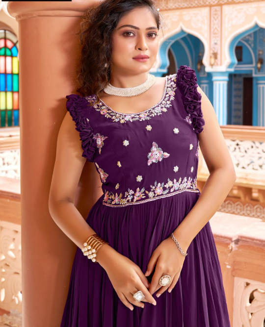 Georgette Embroidered Anarkali Gown With Ruffle Sleeves