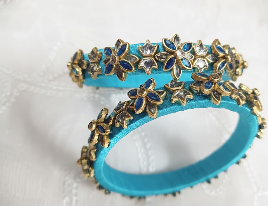 Gorgeous Blue Silk Thread Bangles With Flower Shape Kundans - Flynker