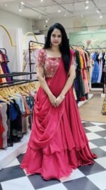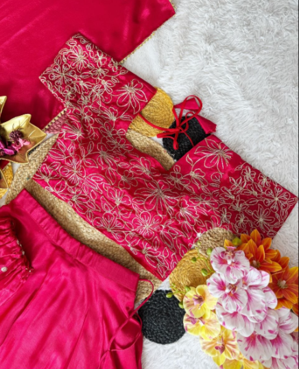 Trendy Pink Chinon Ready-To-Wear Lehenga Set With Floral Work