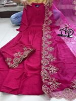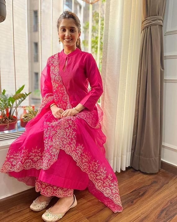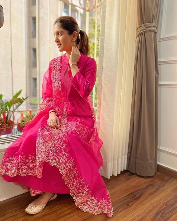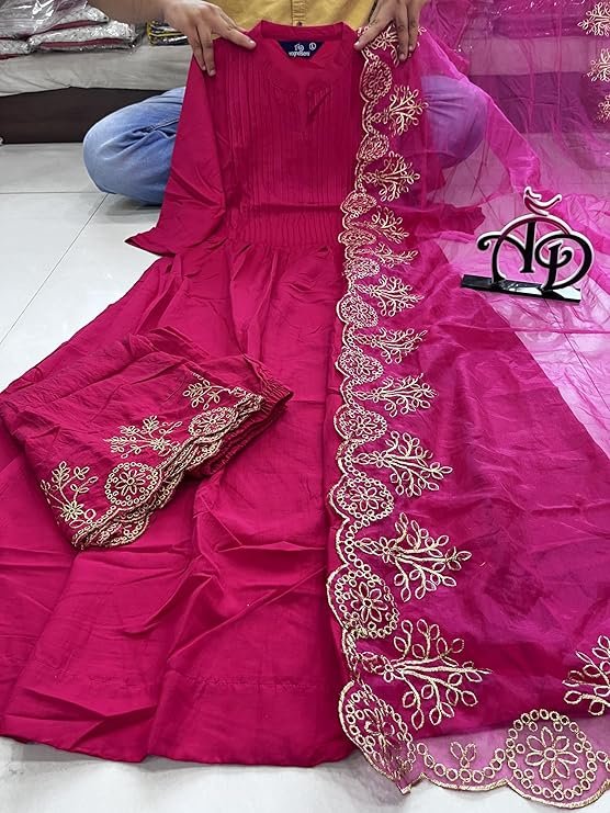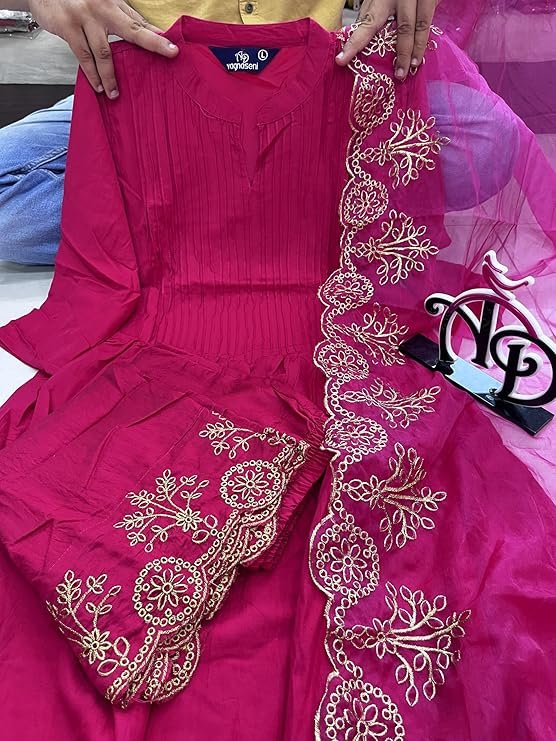 Home Hot Sale Gorgeous Pink Cotton Silk Kurti Suit Set With Organza Dupatta