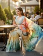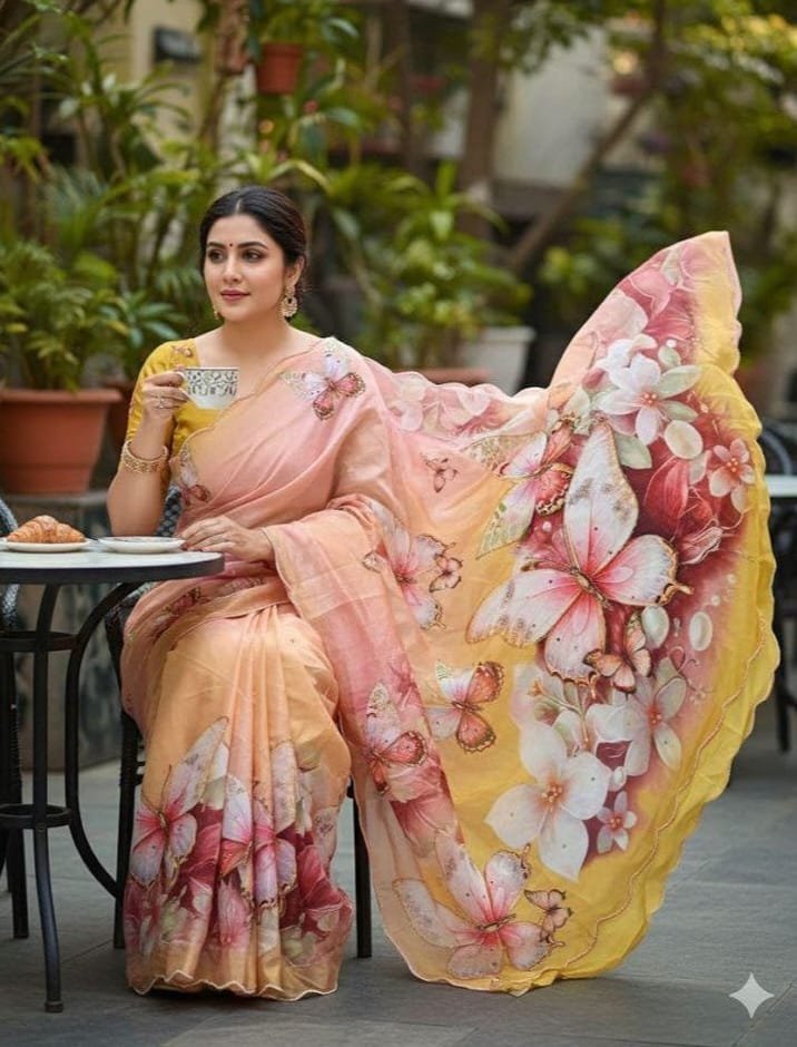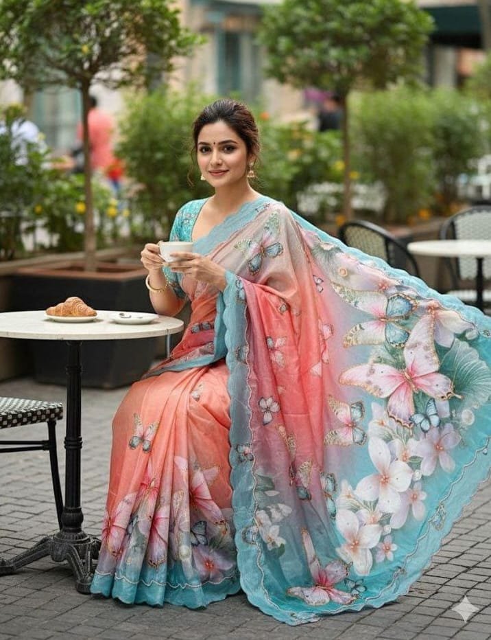 Pure Malai Silk Saree With Beautiful Digital Prints Butterfly & Flower With Hand Cut Dana Seqnce Work in All Over Sarees Heavy Outing Pearl & Thread Border in All Over Saree, Paired With Malai Silk Fabric With Pearl (Moti Handwork) Work Blouse.