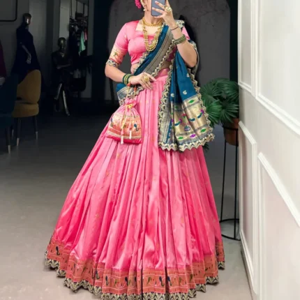 Trending Pink Jacquard Silk Paithani Lehenga With Sequins Work