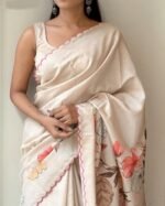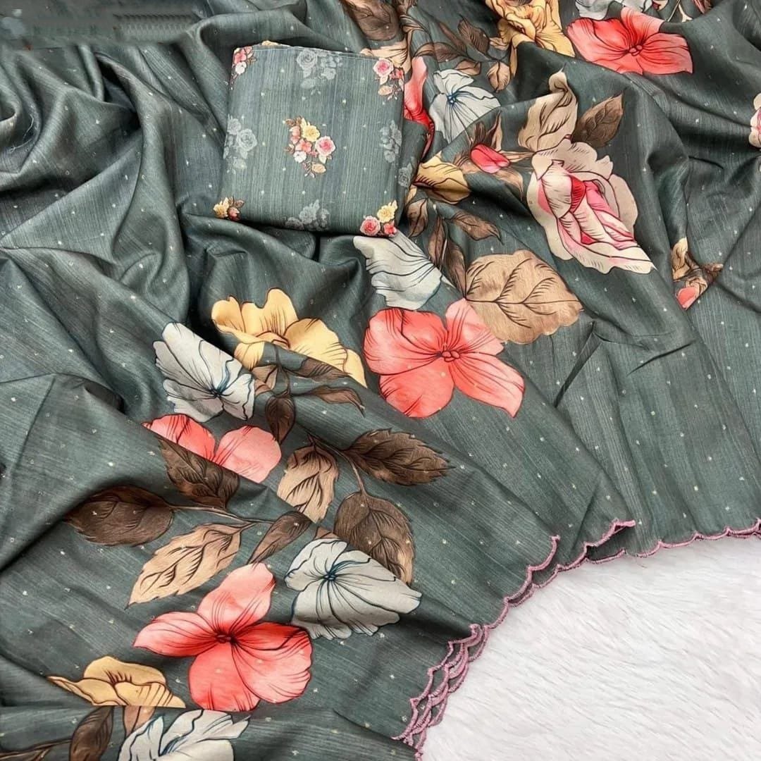 Saree Fabric: Heavy Handloom Tussar Silk Saree With Tulips Digital Print and Arco Border All Over Saree With Perfectly Matched Blouse Piece and Pallu.