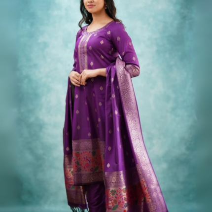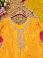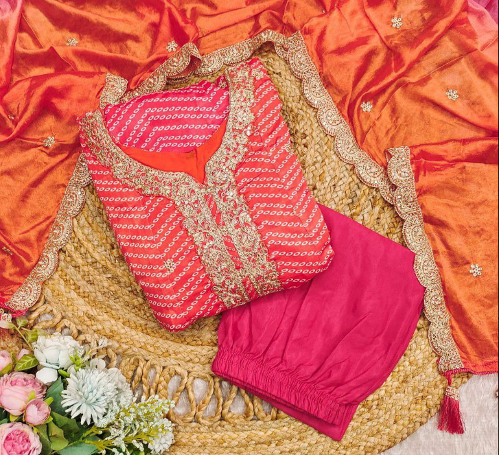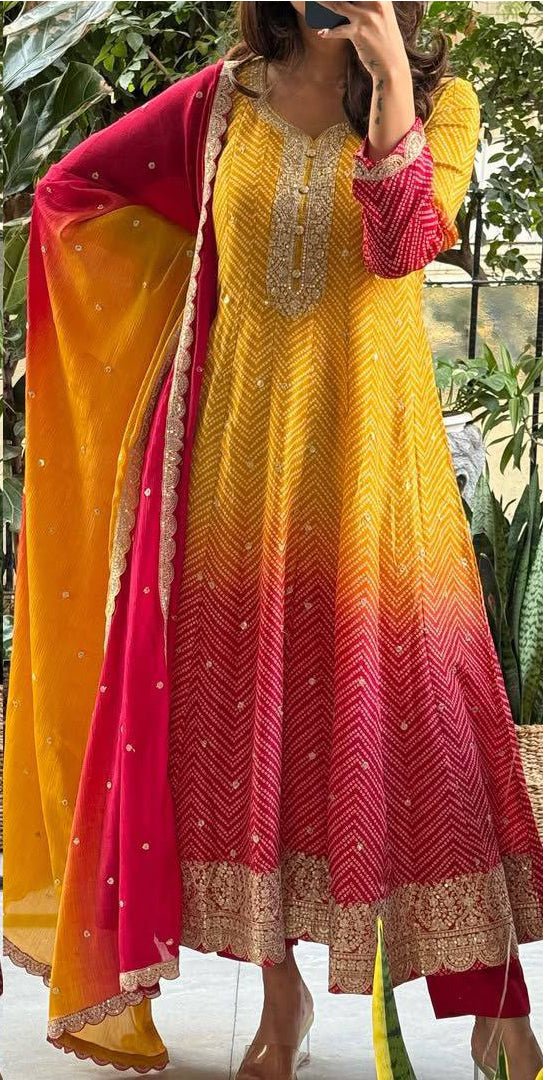 This Is A Vibrant And Festive Outfit With A Mix Of Traditional And Contemporary Elements. It Features A Unique Pattern, Likely Created Using A Tie-Dye Or Resist-dye Technique, Combined With Embroidery. It Appears To Be A Three-Piece Set, Consisting Of A Kurta, Salwar And Dupatta. The Color Outfit Showcases A Striking Dual-tone Or Ombre Effect, Transitioning From A Bright Yellow At The Top To A Deep Red At The Bottom. The Salwar Is A Solid Red Color. The Embroidery Designs Are Likely Floral Or Paisley-Inspired, Complementing The Patterned Fabric.
