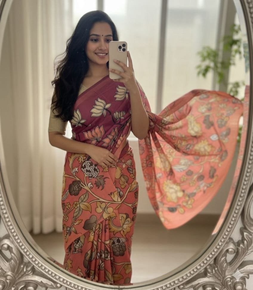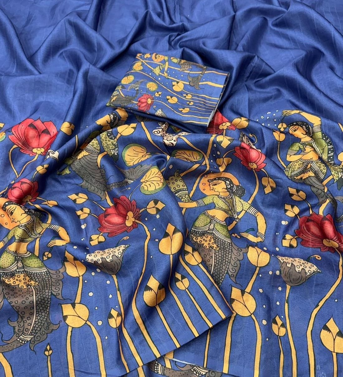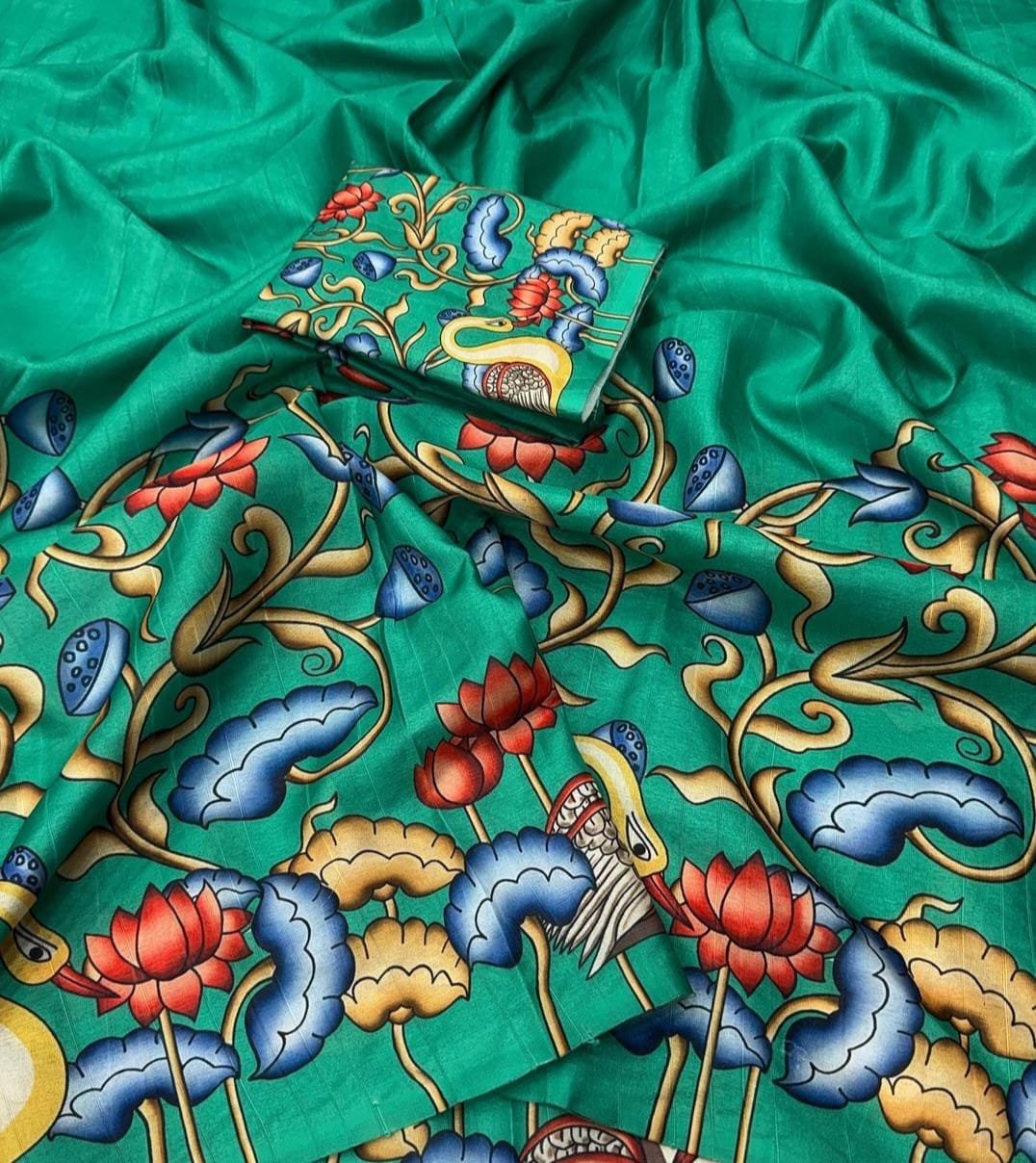 Fabric – Handloom Tussar Silk Kalamkari Digital Print Comes With Tussle on Pallu.