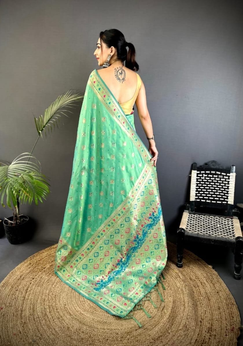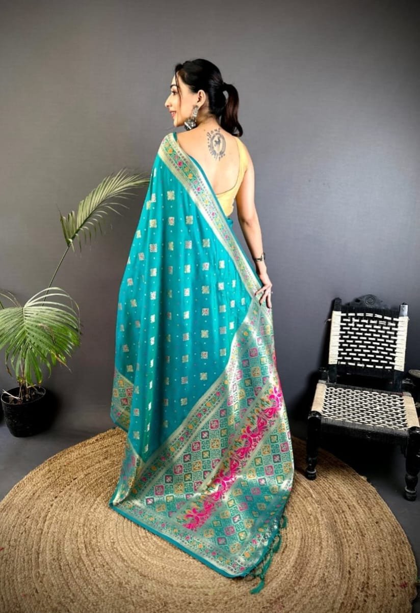 Fabric :- Heavy Soft Banarasi Lichi Silk Saree Patola Style New Concept Multicolour Minakari Weaving With Awesome Design And Attractive Color Combination With Beautiful Pallu Design And Tussel On Border.