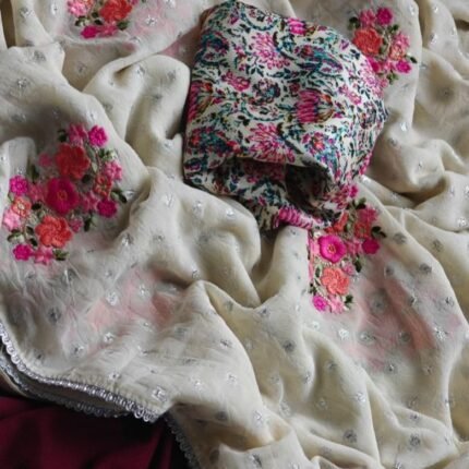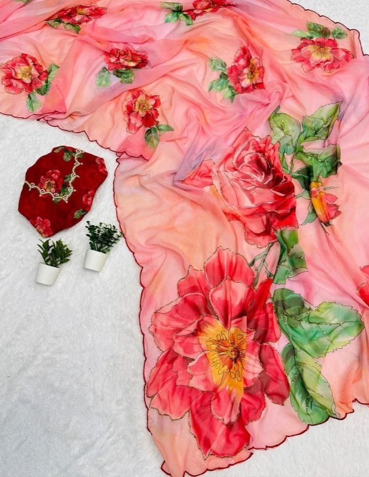 Fabric – Soft & Smooth Weightless Chiffon Floral Digital Print With Beautiful Pipe Work and Embroidery Cut Work Border.
