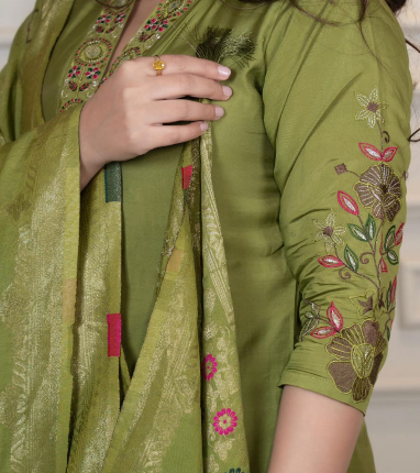 Premium Green Roman Silk Hand Work Kurta Set With Nylon Dupatta