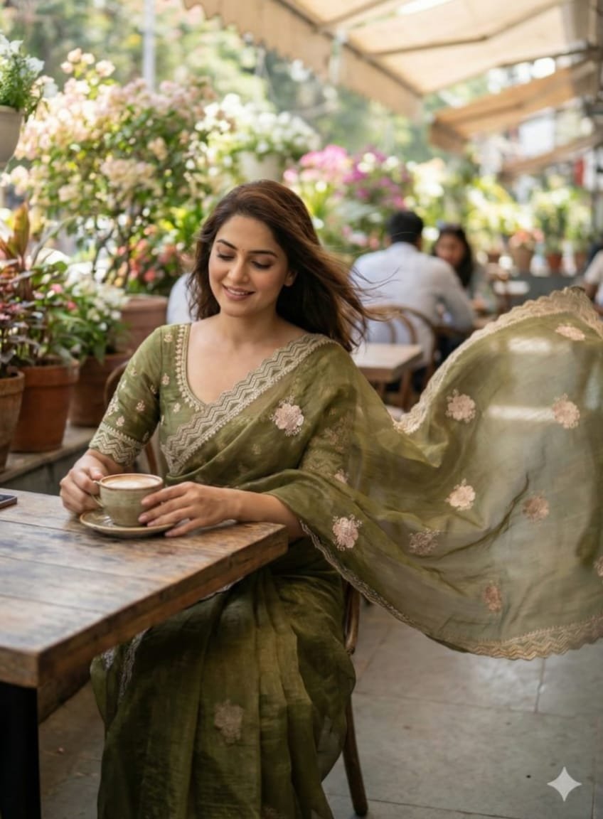 Soft Rich Shiny Dual Shaded Crunchy Silk Saree Along With Trendy C – Pallu Work Along With Designer Swarovski Work & Matching Worked Blouse.