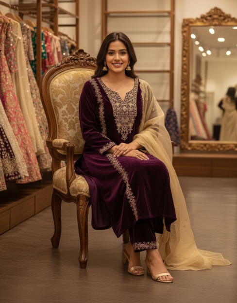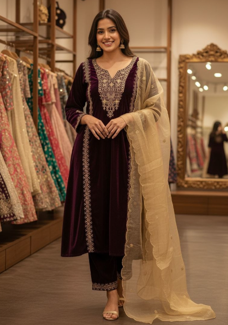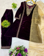 Velvet Kurti, Dupatta & Pant Embroidered Kurti On Velvet Fabric With Dupatta & Plazzo Set.