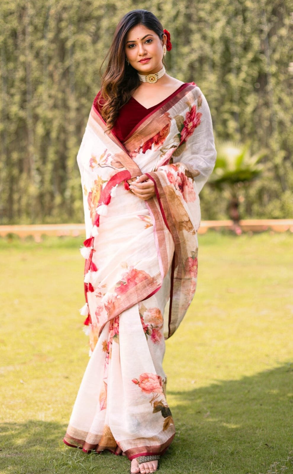 Home Ethnic Wear Sarees Silk Sarees New Cream and Maroon Linen Saree With Floral Print