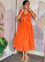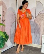 Orange Beautiful Pure Mul Chanderi Frock with Handwork - Flynker