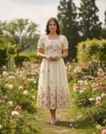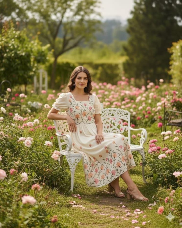 Crafted with meticulous attention to detail, this dress boasts delicate Chain Stitch embroidery that adds a touch of artisanal charm. The color combination complements each other and exudes warmth and sophistication, perfect for those balmy summer days and sultry evenings.
