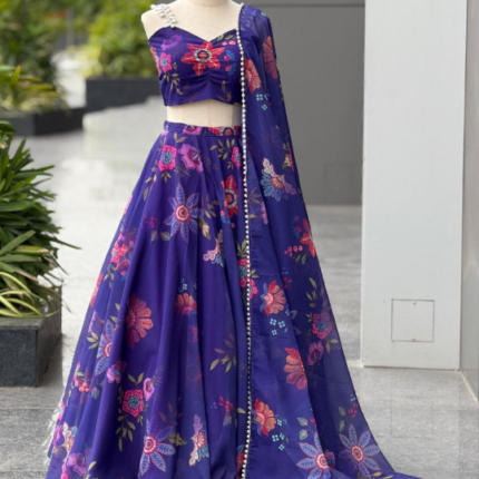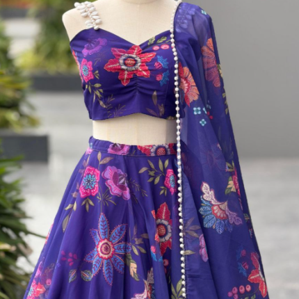Classy Blue Organza Silk Lehenga Choli With Floral Print