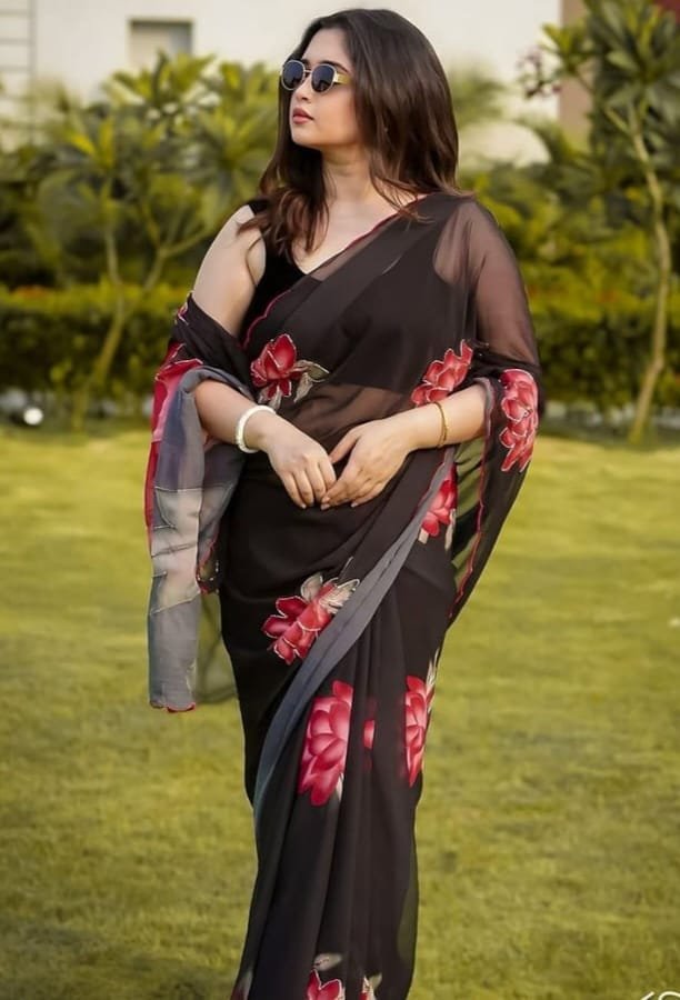 It has all over Digital print with handwork (Khatli) work Digital printed saree.