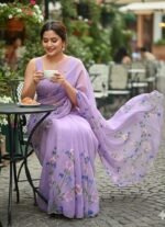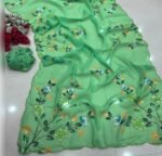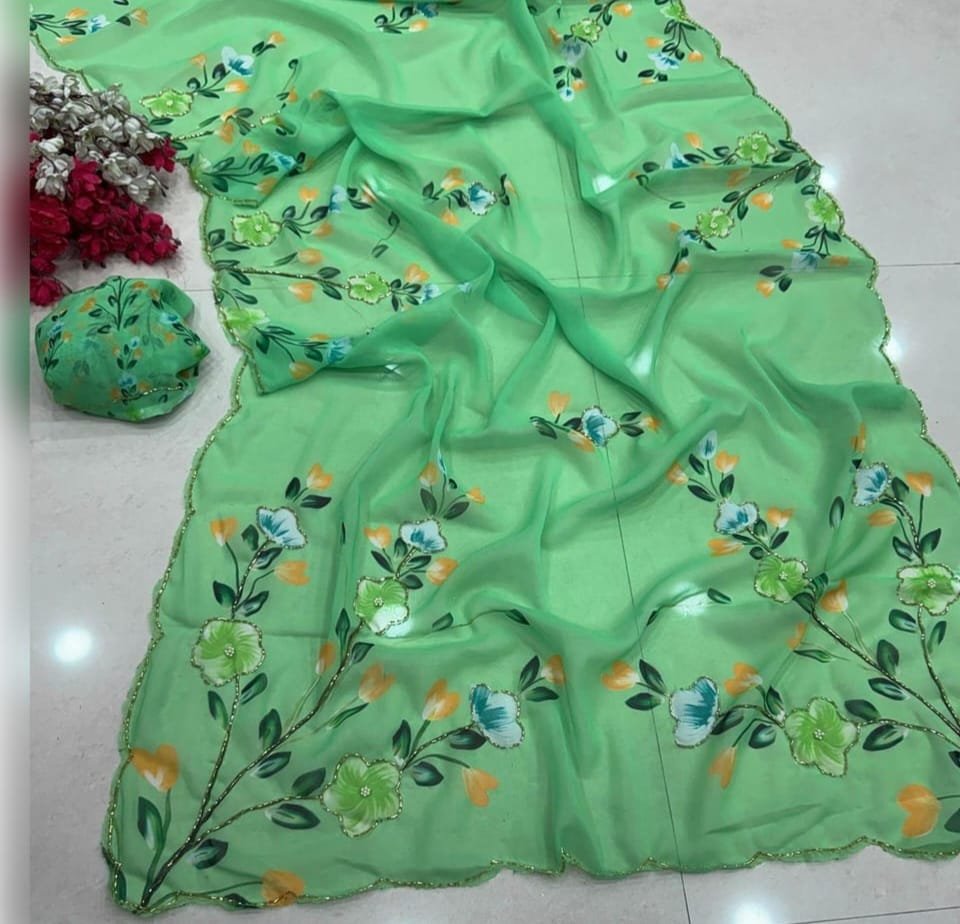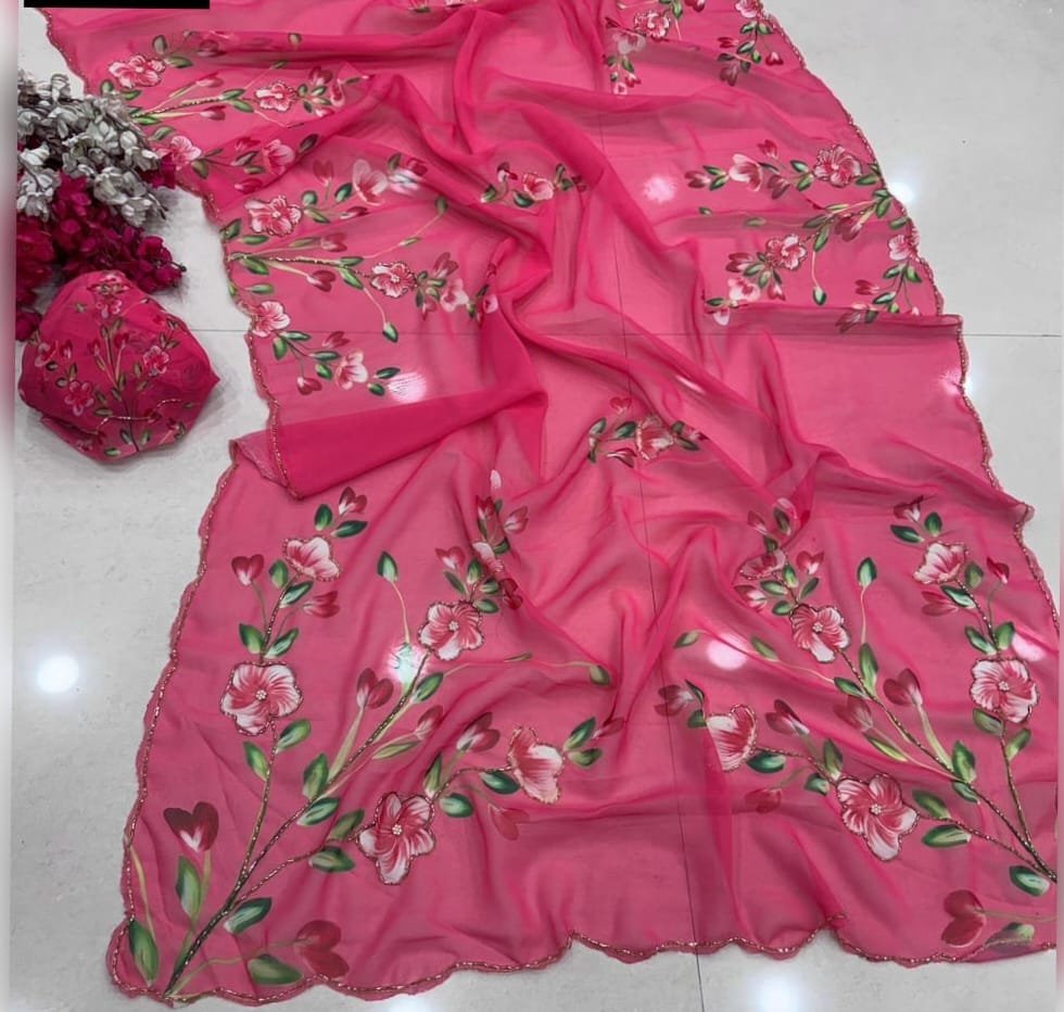 Pure Soft Georgette Silk Saree with beautiful digital prints flower and hand cut dana+ heavy outing border in all over saree, paired with blouse.