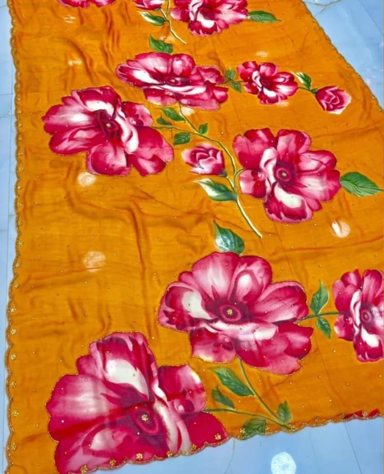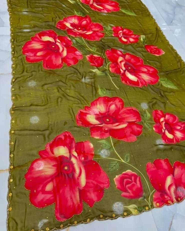 Very Soft and Elegant Georgette Silk Fabric With Beautiful Flower Digital Print With Cut dana Moti and Sequence Khatli Work In Saree and Cut dana Border Aarco..