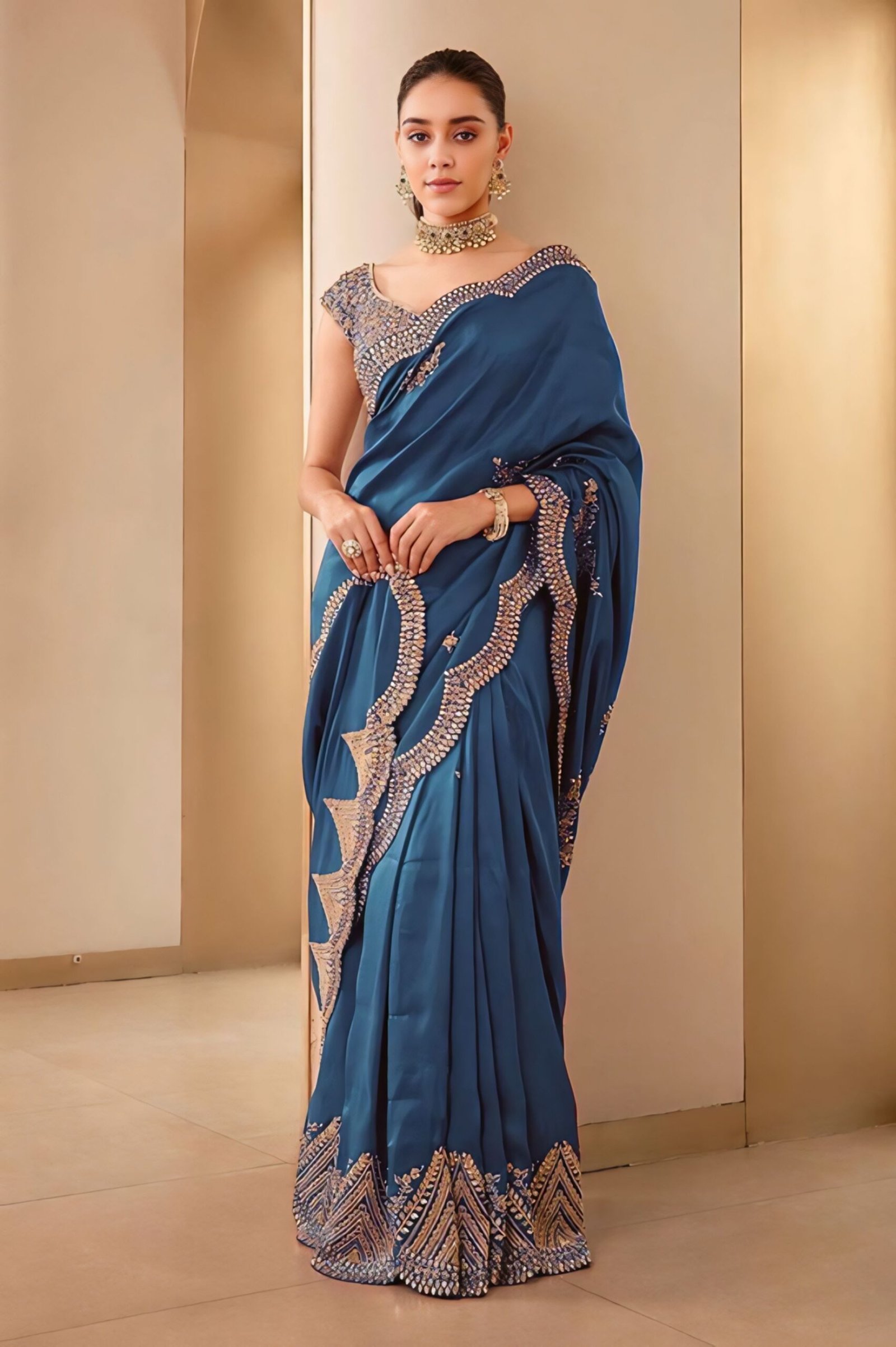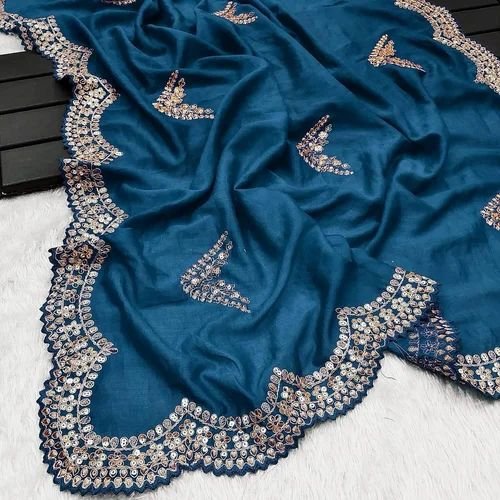 Home Hot Sale Teal Blue Silk Saree With Sequins Work On Blouse