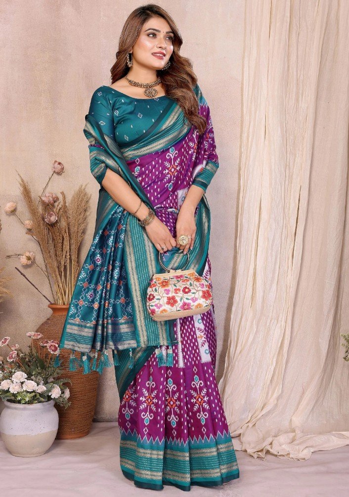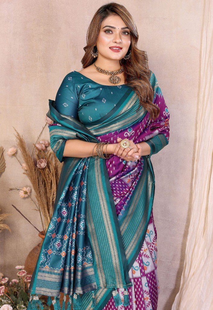 Add Royal Charm To Your Ethnic Collection With This Elegant Soft Silk Saree, Finely Crafted With Traditional Ikkat Weaving And Luxurious Zari Detailing.