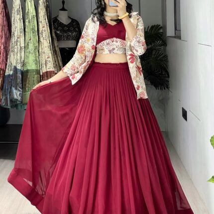 Stunning Maroon Georgette Embroidered Lehenga Choli With Koti
