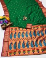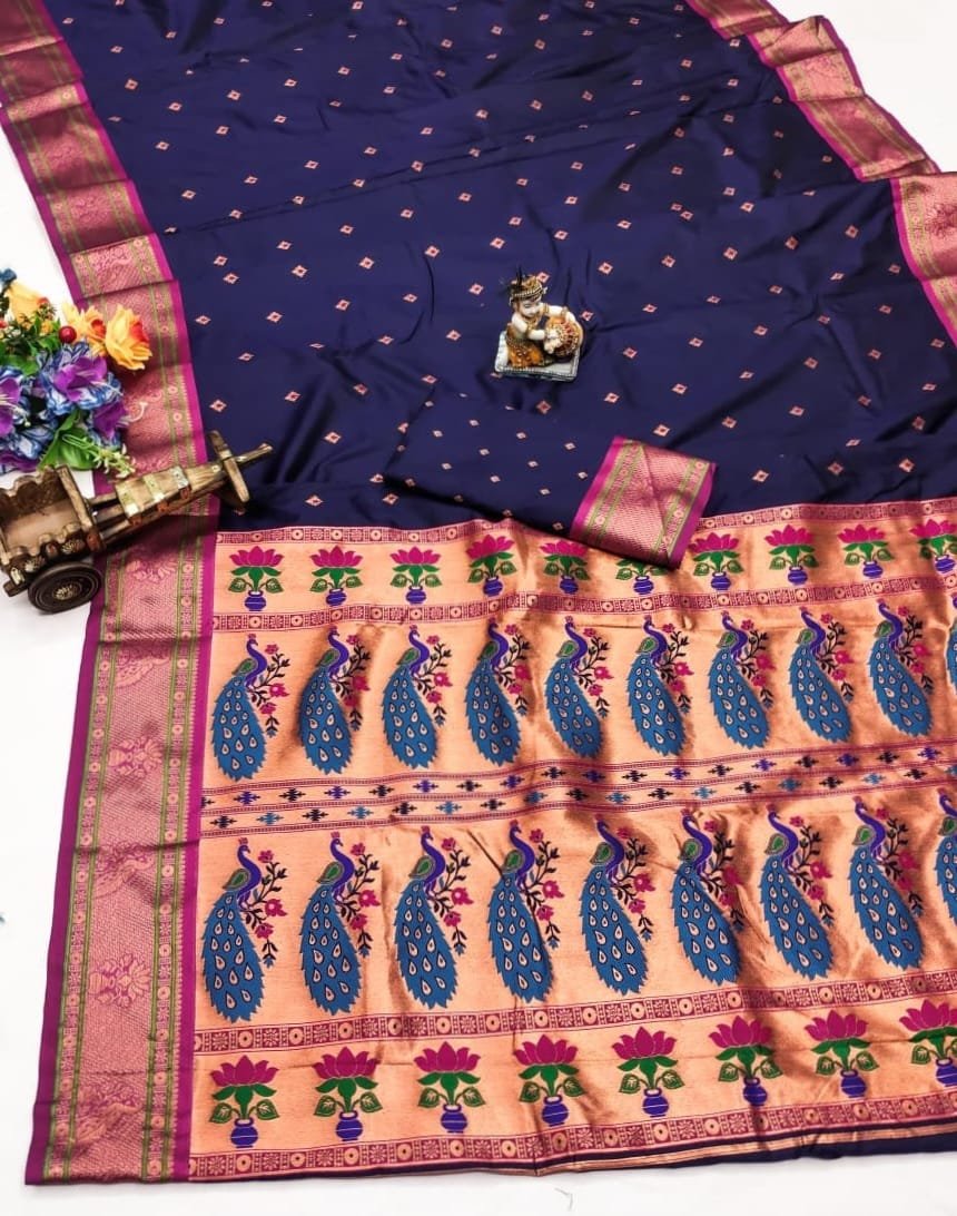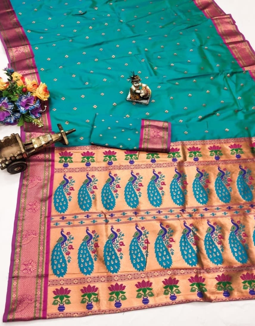 Fabric :- New Concept Attractive Design Beautiful Pure Soft Banarasi Silk With Peacock Design & Pallu Copper Jari And Dashing Border Weaving.
