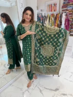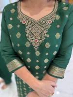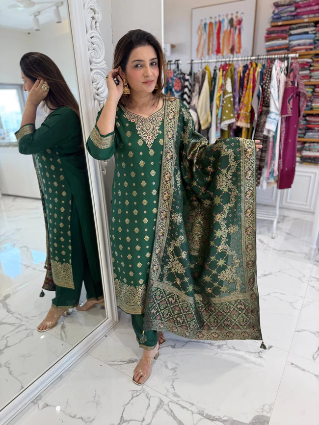 Home Hot Sale Trendy Emerald Banarasi Suit Set With Printed Work