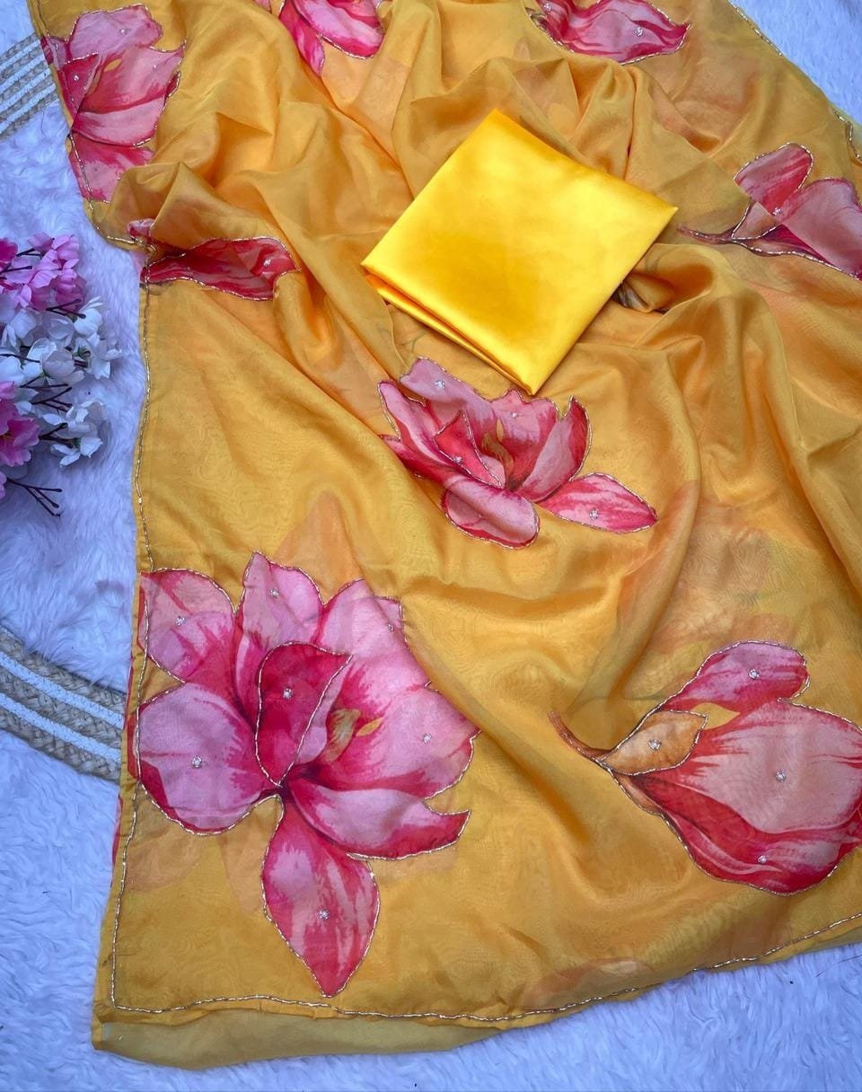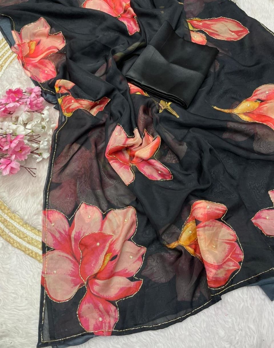 Pure Soft Georgette Silk Saree With Beautiful Digital Prints Flower and Hand Cutdana Heavy Outing Border in All Over Saree, Paired With Blouse.