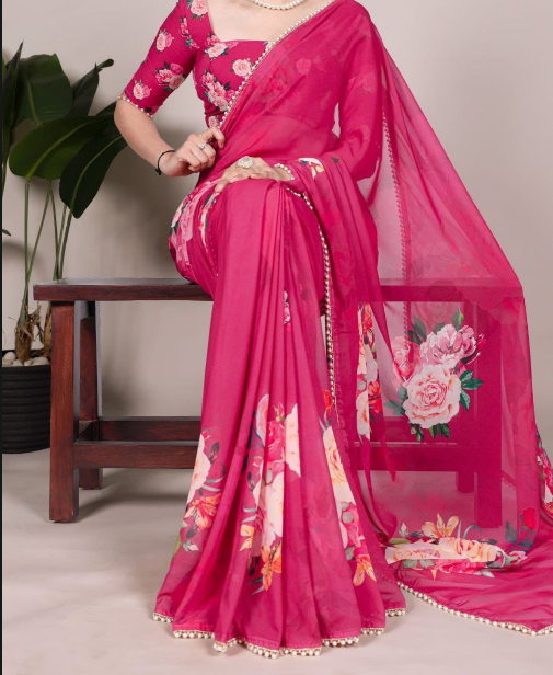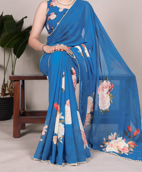 Trendy Georgette Floral Printed Saree With Pearl Lace Border