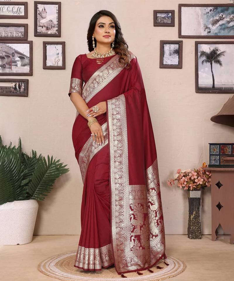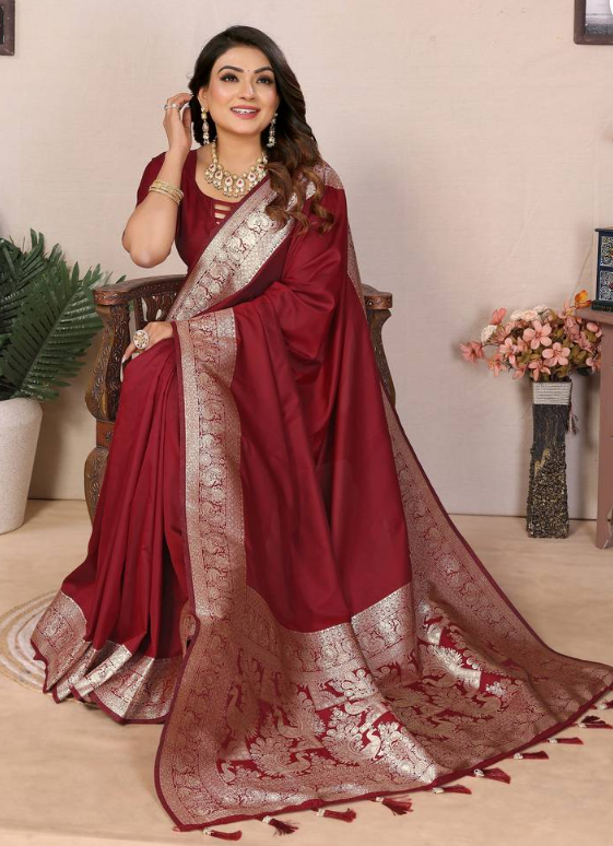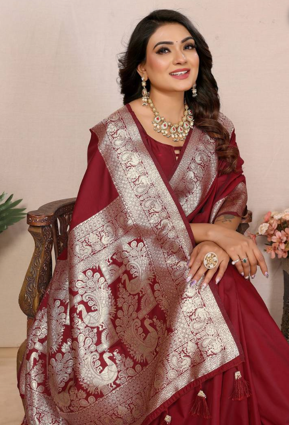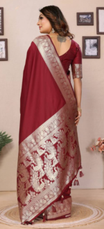 Trendy Maroon Banarasi Silk Saree With Exclusive Work