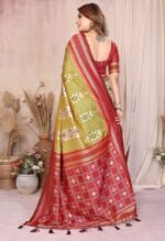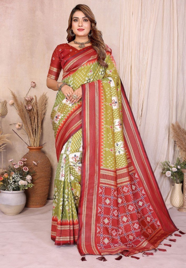 Add Royal Charm To Your Ethnic Collection With This Elegant Soft Silk Saree, Finely Crafted With Traditional Ikkat Weaving And Luxurious Zari Detailing.