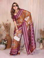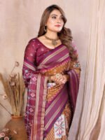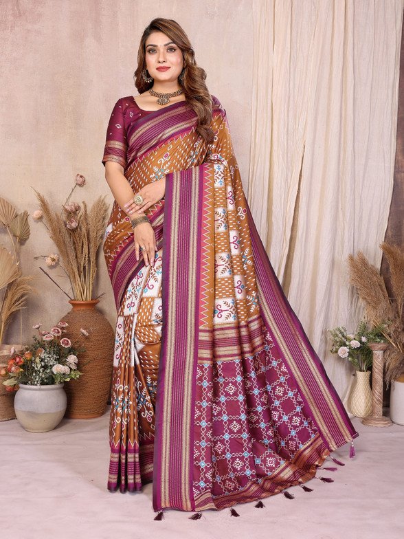 Home Hot Sale Wine Brown Soft Silk Ikkat Weaving Saree With Rich Zari Border
