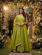 Home Hot Sale Women’s Party Wear Flared Green Gown With Embroidered Dupatta & Bunch of Latkans