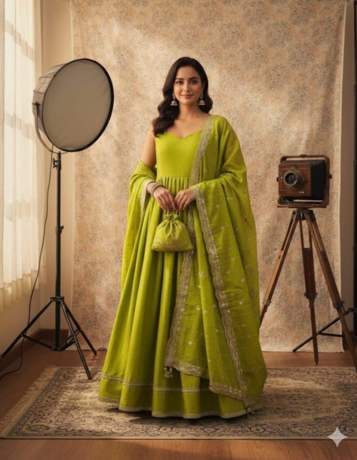 Women’s Party Wear Flared Green Gown With Embroidered Dupatta & Bunch of Latkans