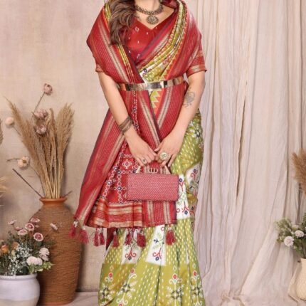 Soft Silk Ikkat Weaving Saree With Rich Zari Border.